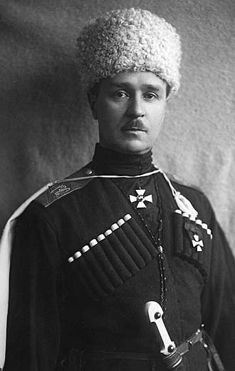 Andrey Grigoriyevich Shkuro was a Lieutenant General (1919) of the White Army who served in the Kuban Cossack Host. In World War I, Shkuro became the commander of a special guerrilla unit which executed several daring raids behind Austrian-Hungarian and German lines. During World War I, Shkuro was promoted to the rank of colonel.